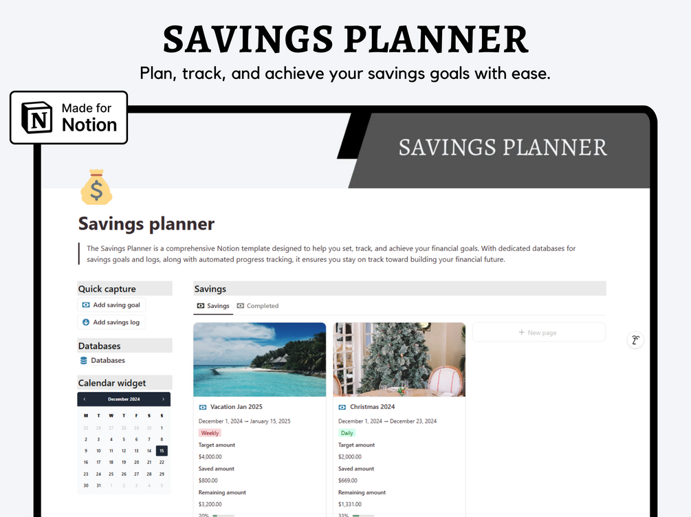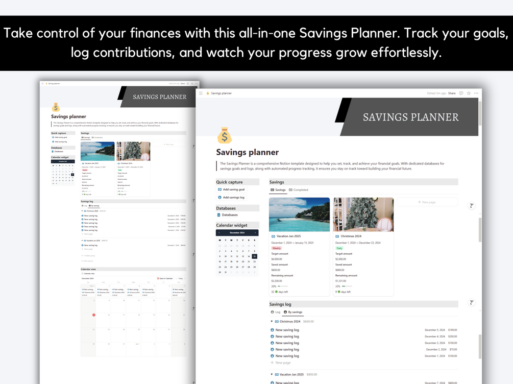 The Savings Planner is a simple yet powerful Notion template designed to help you achieve your financial goals with ease. Featuring two core databases—Savings Goals and Savings Log—it allows you to set clear targets and track your contributions seamlessly.