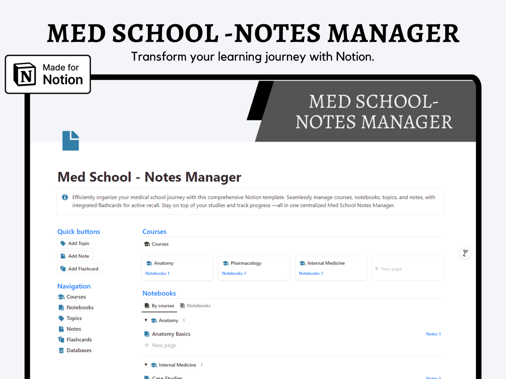 Medical school is a marathon, not a sprint, and keeping your notes organized is half the battle. Our Med School Notes Manager Notion template is built to do more than just store your notes—it's designed to help you study smarter and conquer your classes.